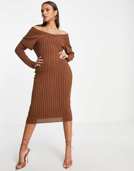 Femme Luxe – Czekoladowobrązowa sukienka dzianinowa z dekoltem bardot