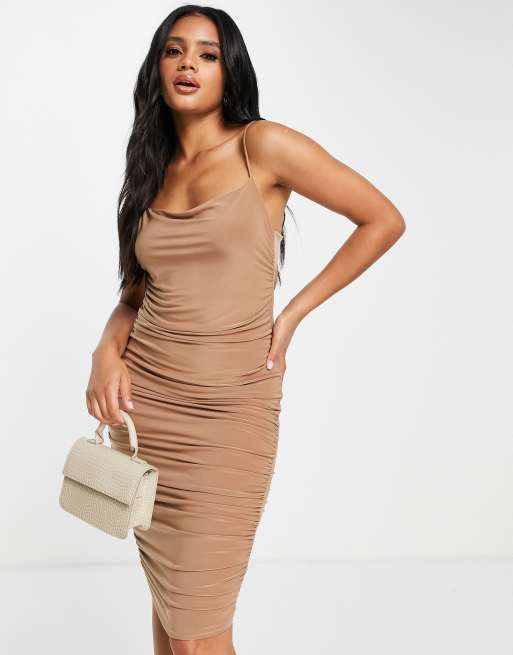Femme Luxe – Jasnobrązowa marszczona sukienka midi typu bodycon