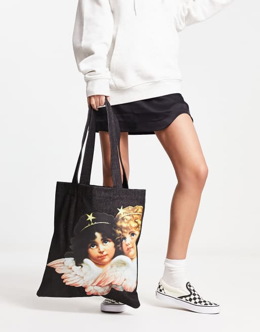 Fiorucci – Czarna jeansowa torba typu tote z nadrukiem aniołków