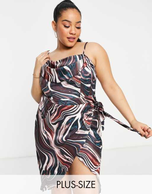 First Distraction The Label Plus – Granatowa satynowa sukienka midi o kopertowym kroju z marmurowym wzorem