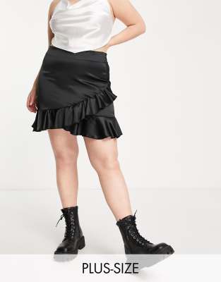Flounce London Plus – Czarna satynowa spódnica mini o kopertowym kroju