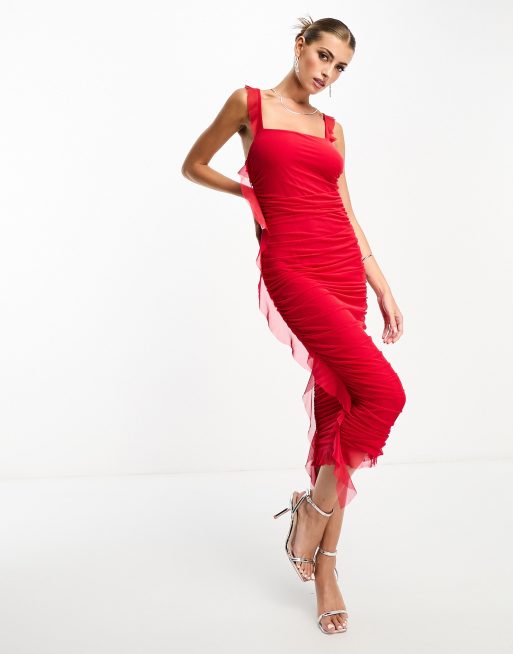 Flounce London – Czerwona sukienka mini z siateczki z falbanką i dekoltem karo