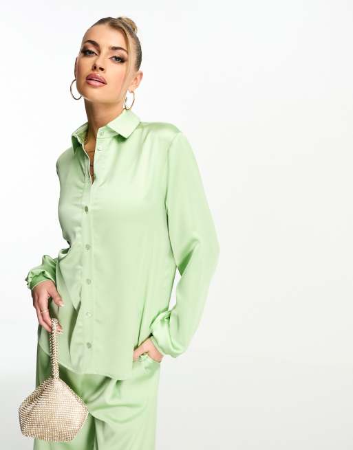 Flounce London – Satynowa koszula zapinana na guziki w jasnym kolorze khaki, część zestawu