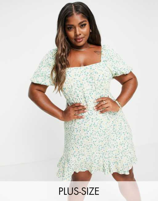 Forever New Curve – Sukienka mini z dekoltem karo i bufiastymi rękawami w pistacjowy kwiatowy wzór