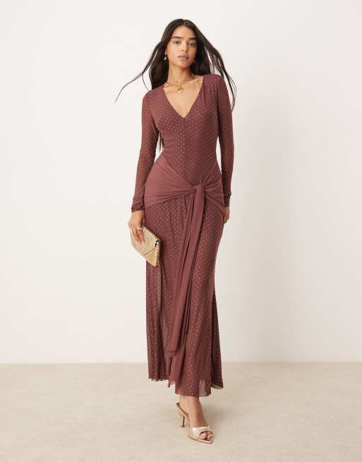 Forever New – Czekoladowa sukienka maxi z długimi rękawami, głębokim dekoltem i dżetami