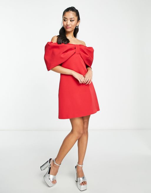 Forever New – Czerwona sukienka mini z kokardą opadającą na ramiona