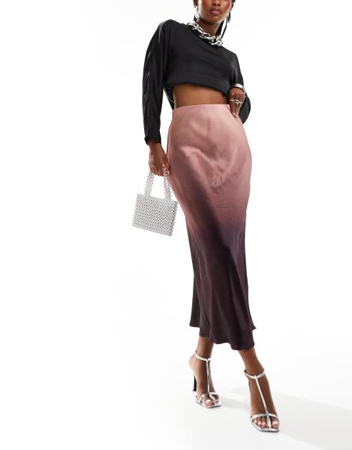 Forever New – Czerwonobrunatna satynowa spódnica maxi cięta ze skosu z efektem ombre