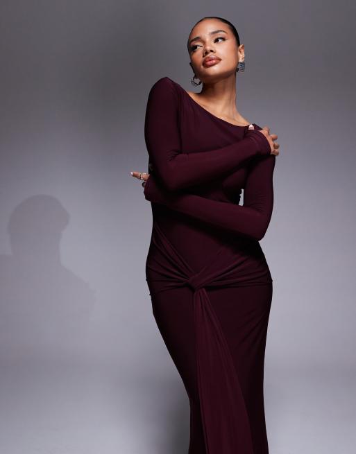 Forever New – Drapowana sukienka maxi z długimi rękawami w ciemnym śliwkowym kolorze