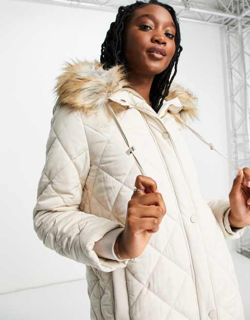 Forever New – Kremowy pikowany płaszcz puchowy w romby z kapturem ze sztucznego futra