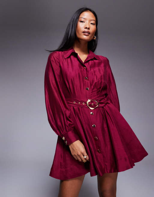 Forever New Petite – Ciemnoczerwona sukienka koszulowa mini z przeszyciami i paskiem