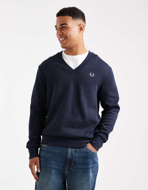 Fred Perry – Granatowy prążkowany sweter z dekoltem w kształcie litery V