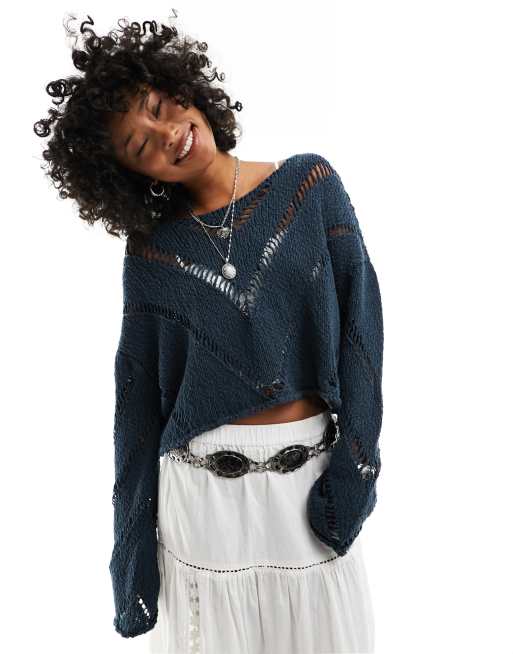 Free People – Ciemnoniebieski krótki sweter o luźnym kroju z ażurowej dzianiny