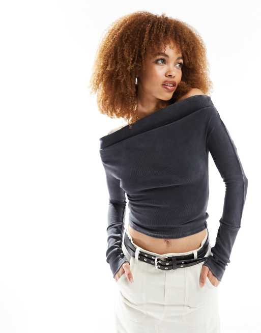 Free People – Czarny prążkowany top z odkrytymi ramionami i efektem sprania