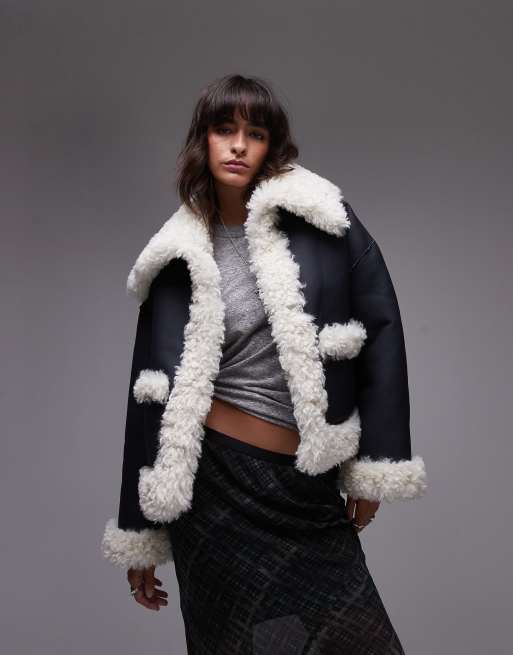 Free People – Kiki – Czarna kurtka oversize z kremowym kożuszkiem