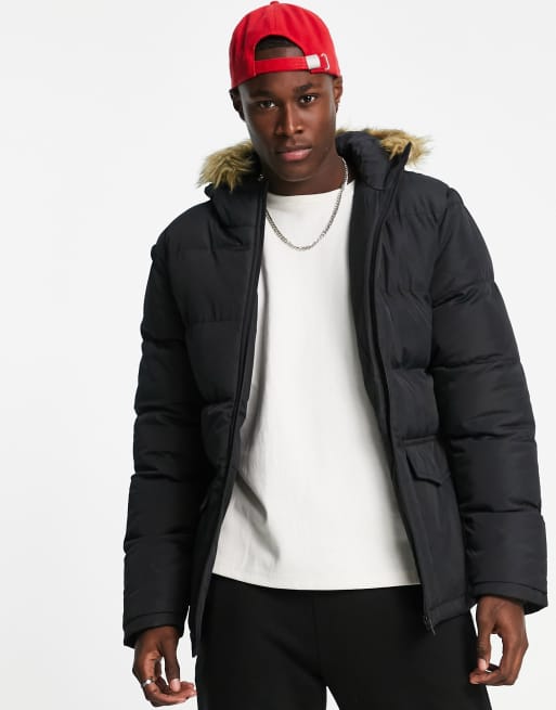 French Connection – Czarna ocieplana parka z kapturem obszytym sztucznym futerkiem
