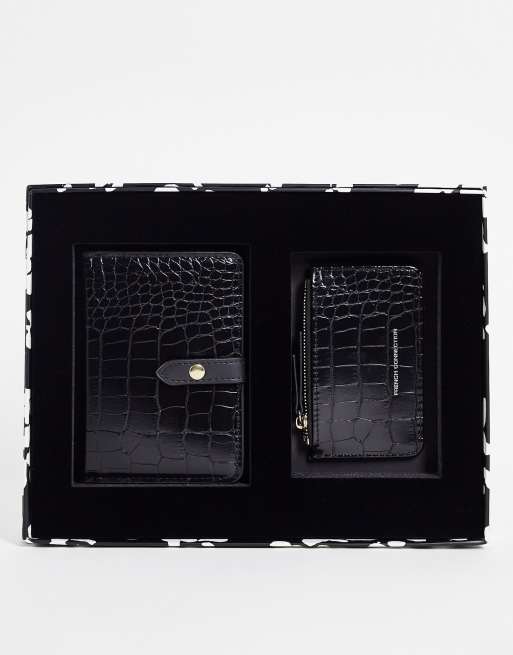 French Connection – Czarny zestaw z imitacji skóry krokodyla: portmonetka i etui na paszport
