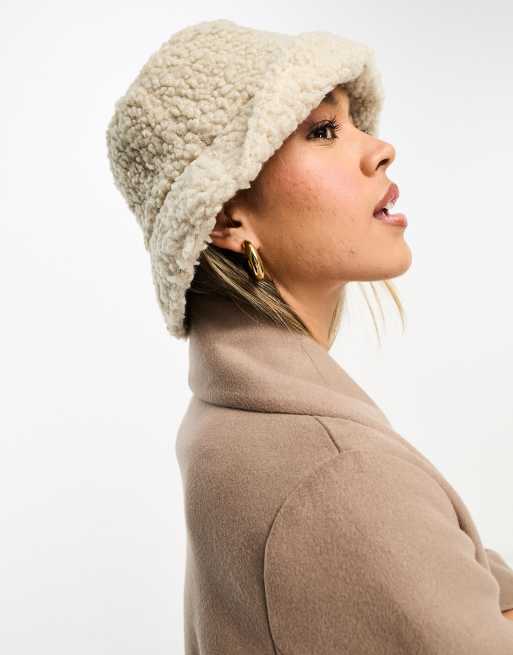 French Connection – Kamiennobeżowy kapelusz typu bucket ze sztucznego kożuszka