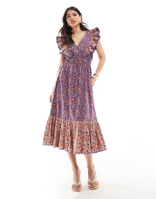 French Connection – Niebieska sukienka midi we wzór paisley z falbankami