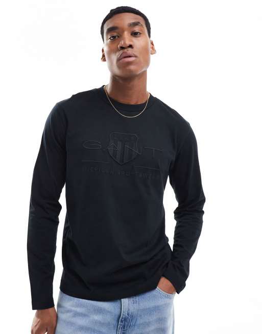 GANT – Czarny T-shirt z długimi rękawami i wytłoczonym, stonowanym logo z tarczą