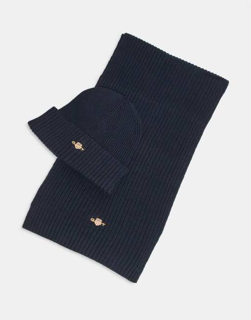 GANT – Niebieski zestaw podarunkowy z dzianiny o warkoczowym splocie: czapka beanie i szalik