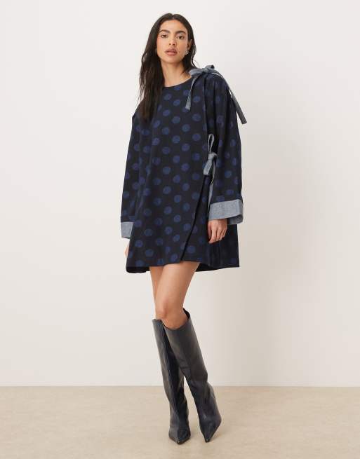 Ghospell Exclusive – Jeansowa sukienka mini o pudełkowym kroju z kokardkami w groszki
