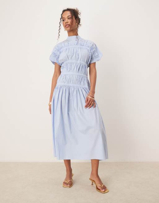 Ghospell – Marszczona niebieska sukienka midi z zabudowanym dekoltem