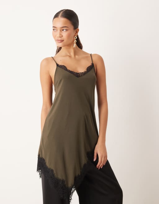Gina Tricot – Ciemnobrązowy asymetryczny top na ramiączkach z koronką