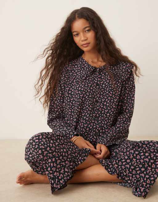 Glamorou – Czarna piżama w drobny różowy wzór kwiatowy: koszula i spodnie