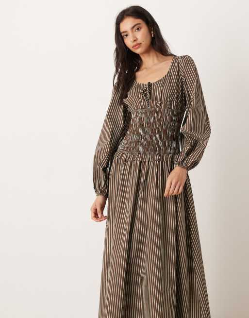 Glamorous – Brązowo-niebieska sukienka maxi w paski z obniżoną talią i marszczoną górą