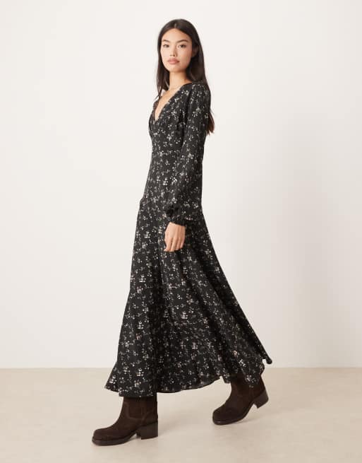Glamorous – Czarna sukienka maxi z dekoltem w szpic w drobny brązowy kwiatowy wzór