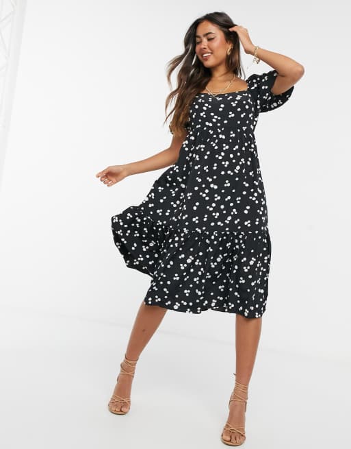 Glamorous – Czarna sukienka midi typu milkmaid w plamki z plisowaną falbaną
