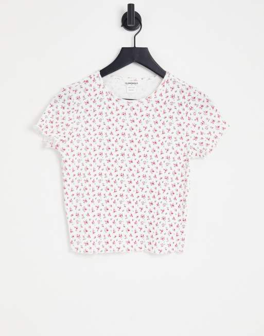 Glamorous – Dopasowany T-shirt mini z prążkowanej dzianiny pointelle w kwiaty z pofałdowanym dołem