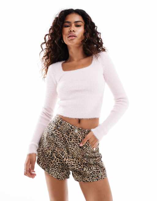 Glamorous – Jasnoróżowy prążkowany sweter z kwadratowym dekoltem z lekkiej dzianiny