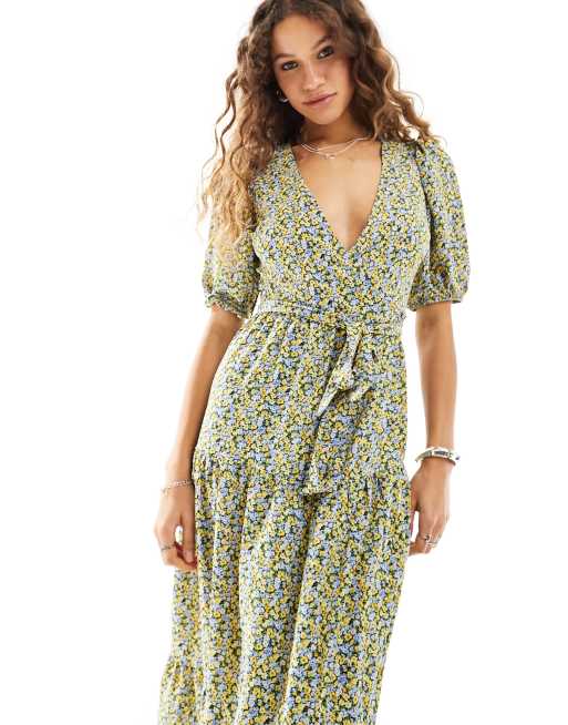 Glamorous – Kaskadowa sukienka maxi z krótkimi rękawami w drobne żółte kwiatki