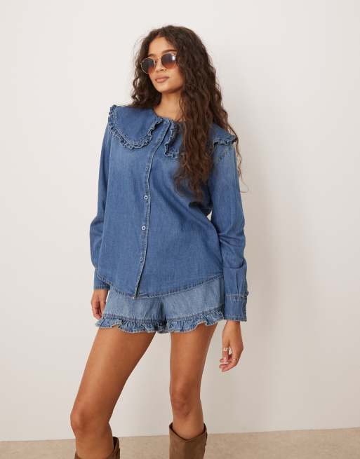 Glamorous – Zapinana na guziki niebieska koszula jeansowa z kołnierzem z falbanką