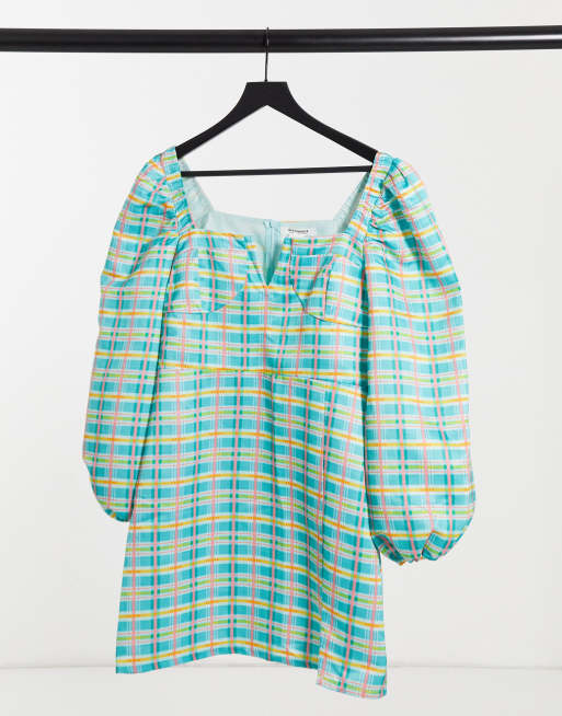 Glamorous – Zielona sukienka mini z kwadratowym dekoltem, bufkami i wzorem w kratę