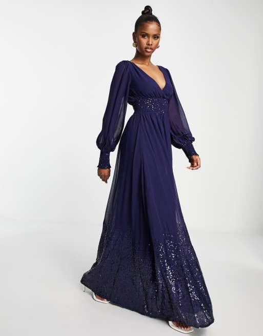 Goddiva – Granatowa sukienka maxi na bal maturalny z długimi rękawami