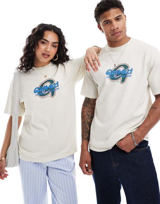 Gramicci Unisex – Szarobeżowy bawełniany T-shirt z grafiką kajaka z przodu