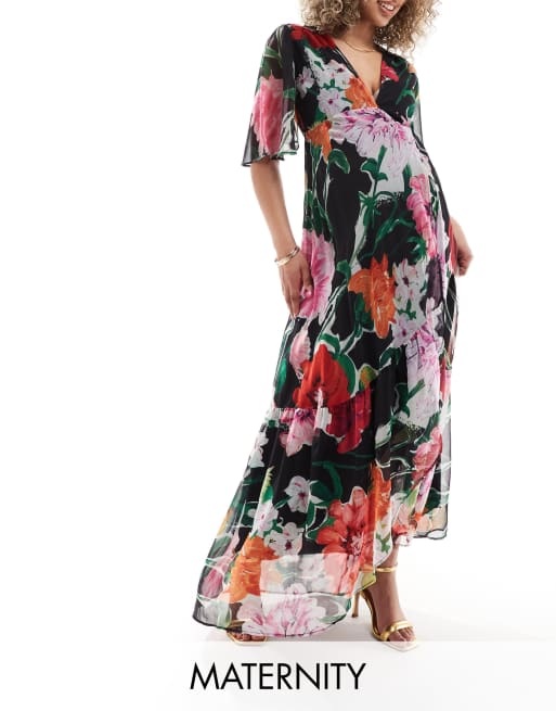 Hope & Ivy Maternity – Czarna kopertowa sukienka maxi w kwiato