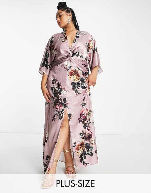 Hope & Ivy Plus – Szarofioletowa satynowa sukienka maxi z kimonowymi rękawami