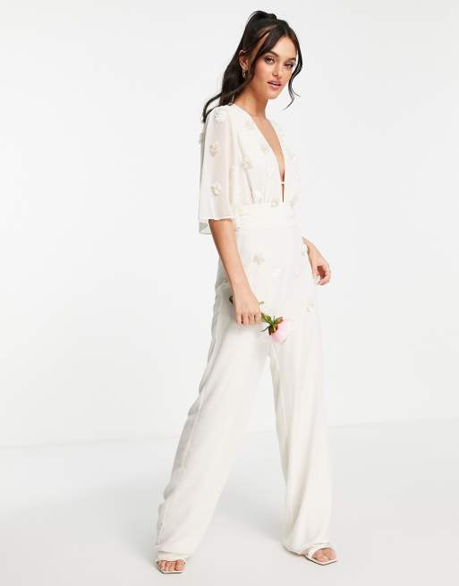 Hope & Ivy Bridal – Haftowany kombinezon z głębokim dekoltem w kolorze kości słoniowej