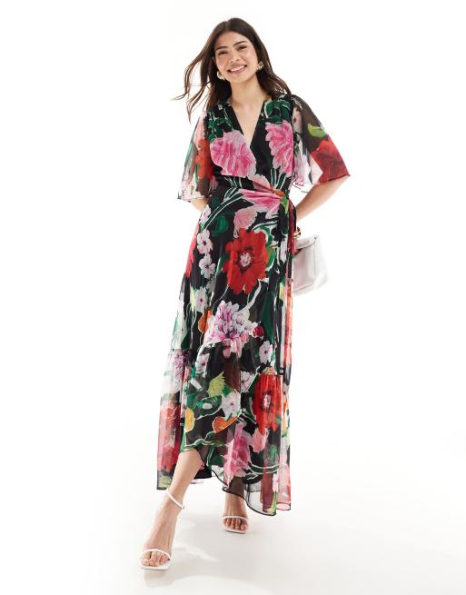Hope & Ivy – Czarna kopertowa sukienka maxi w kwiatowy wzór