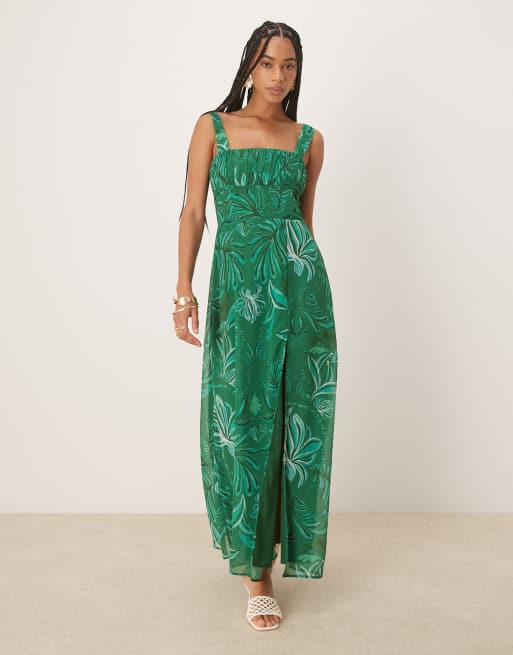 Hope & Ivy – Zielona gorsetowa sukienka maxi we wzór w palmy