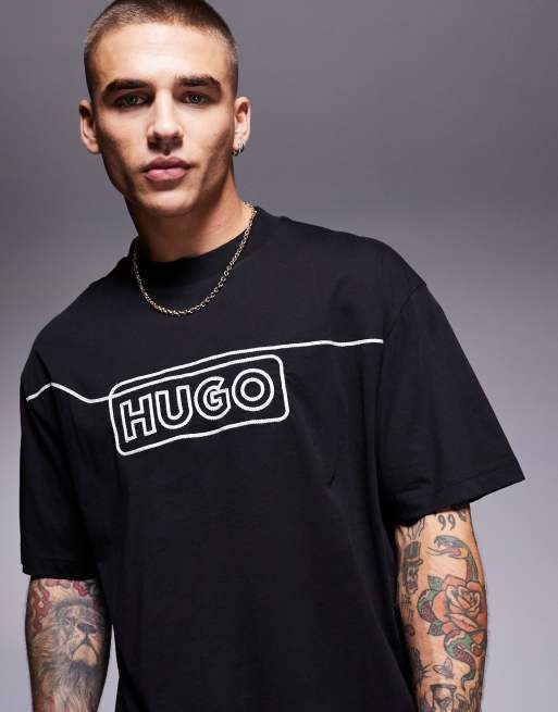 HUGO Blue – Noideryo – Czarny T-shirt o luźnym kroju z paskiem z logo