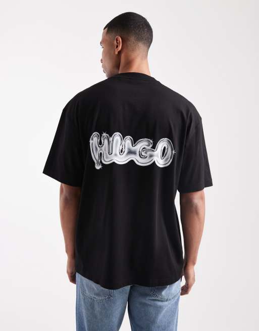 HUGO Blue – Nyrotee – Czarny T-shirt oversize z logo przypominającym balony na plecach