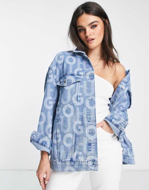 HUGO – Niebieska bawełniana kurtka jeansowa we wzór z logo na całości