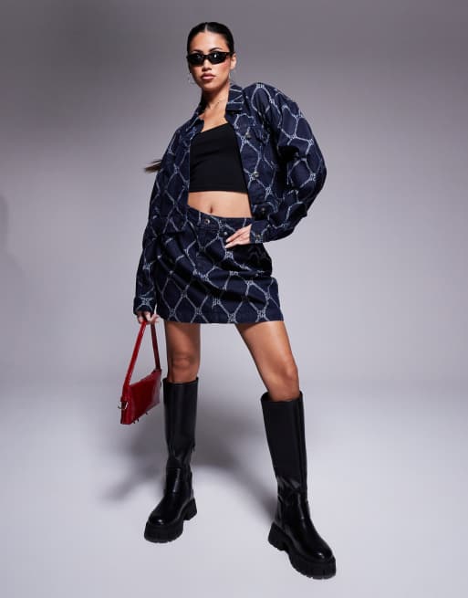 HUGO Red – Gisolia – Ciemnoniebieski zestaw jeansowy: kurtka ze wzorem i spódniczka