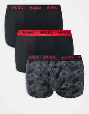HUGO Red – Zestaw 3 par czarnych bokserek gładkich i ze wzorem z logo z taśmą z logo w talii