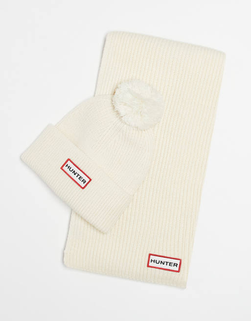 Hunter Unisex – Zestaw podarunkowy: czapka beanie z pomponem i szalik w kremowym kolorze