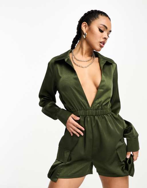 I Saw It First – Marszczony z przodu krótki kombinezon satynowy w stylu utility w kolorze khaki